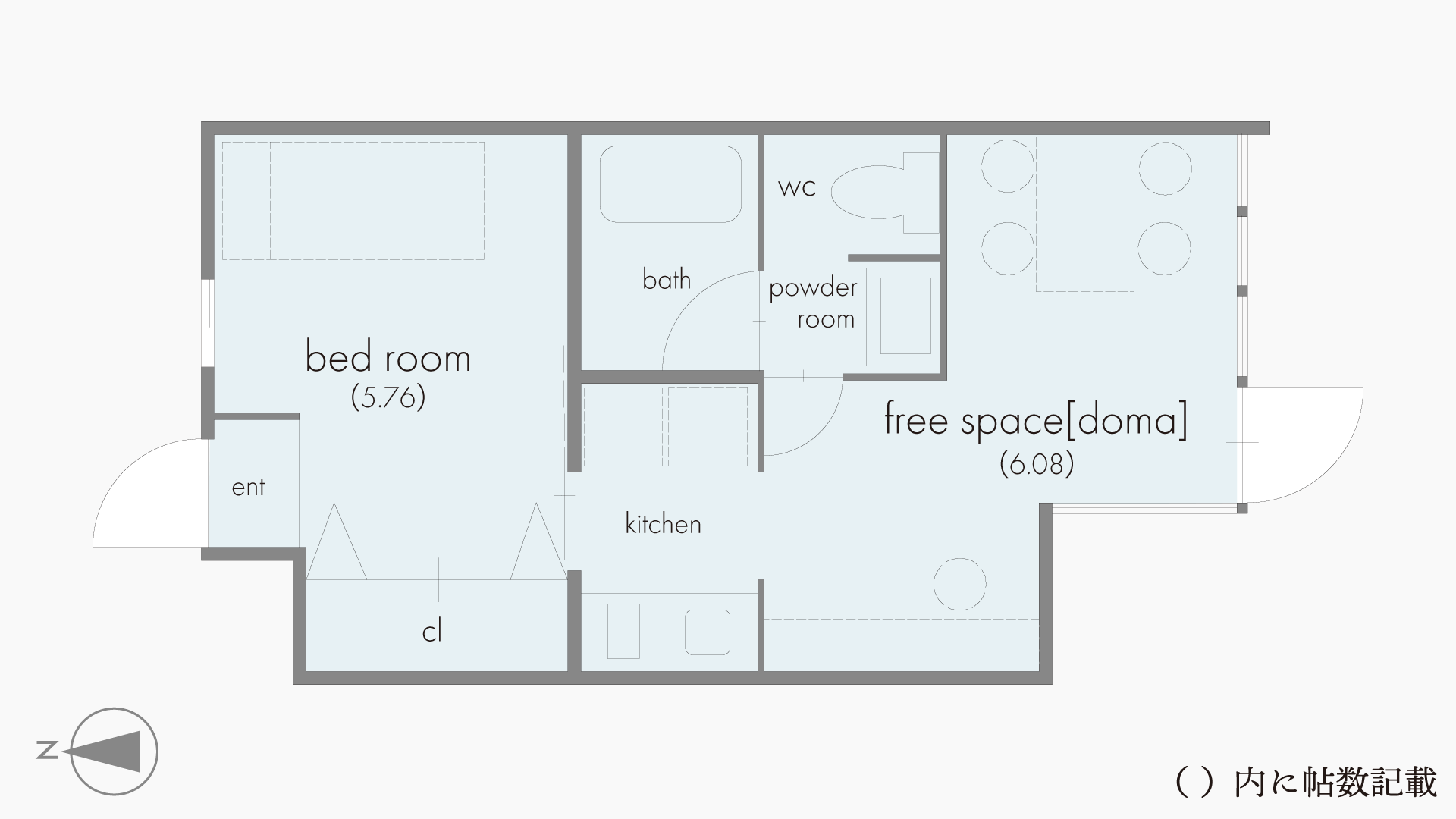 住みながら働くSOHO型住宅は、お客さんを呼んだり、街にひらいたりしやすいように、bed room側の玄関と道路に面したfree space側の入口があります。また、アトリエとしても使えるように、free spaceの床は土間の仕上げ予定。建築や洋裁、デザイナー、カメラマン、ものづくりなどをしている方、住人や地域の人たちと関わりながら暮らしを楽しみたい方のご応募をお待ちしています。